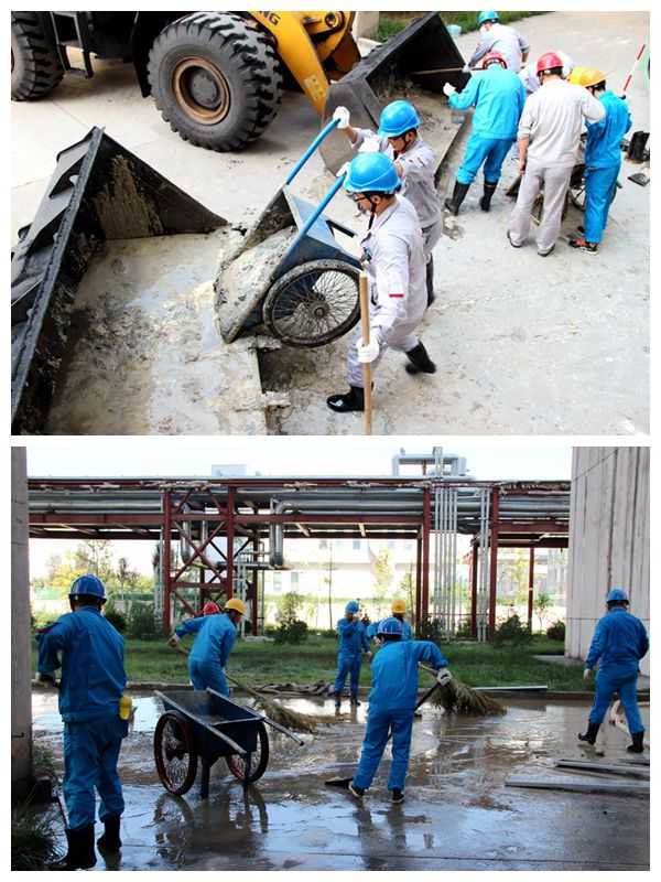 活動(dòng)中,在黨支部書記的戰(zhàn)前動(dòng)員和安排部署下,所有人員被分為兩組,對(duì)一級(jí)塔和二級(jí)塔進(jìn)行清理。布管、沖洗、鏟除、裝車、倒料,雖然現(xiàn)場(chǎng)配有兩輛裝載機(jī),但由于大型機(jī)械無(wú)法靠近脫硫塔人孔,清理工作還需配合人力斗車,一車一車轉(zhuǎn)運(yùn)。時(shí)間緊、任務(wù)重,全體隊(duì)員簡(jiǎn)單解決午飯后,自覺(jué)放棄休息時(shí)間,匆匆又回到勞動(dòng)現(xiàn)場(chǎng),投入到與時(shí)間賽跑的戰(zhàn)斗中。歷經(jīng)8小時(shí)左右的全力奮戰(zhàn),下午16時(shí)所有工作圓滿結(jié)束。