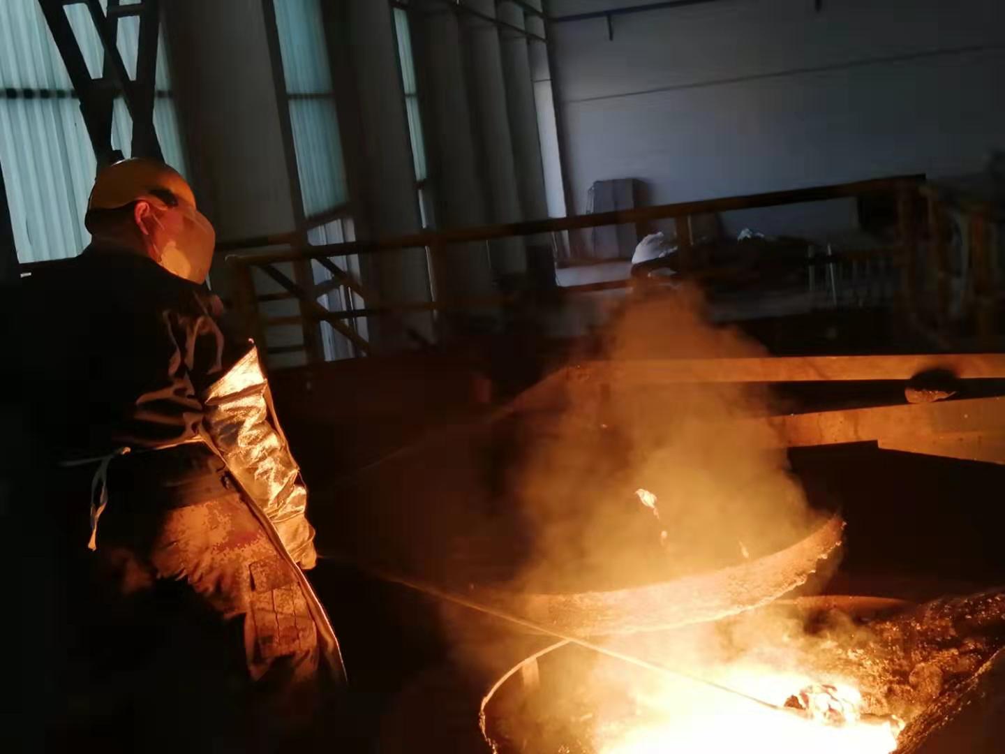 澆筑班組和爐前班組默契的配合,澆筑小車一次次從熔爐里往鐵水包接鐵水的畫面,鐵花閃閃向四周擴(kuò)散絢麗多彩。程長(zhǎng)青班長(zhǎng),穿梭在各個(gè)崗位之間,時(shí)刻關(guān)注生產(chǎn)動(dòng)態(tài),車間隆隆機(jī)器轟鳴聲,澆筑平臺(tái)上的工友們,頂著高溫,嚴(yán)格按照工作程序,把碳?jí)K和導(dǎo)桿連接在一起,用火紅的鐵水融合在一起,赤紅的面孔,汗流浹背,工作服被汗水幾次弄濕,又幾次被高溫烘干,室外的溫度和室內(nèi)的溫度讓工友們窒息,而他們的工作熱情依然不減。
