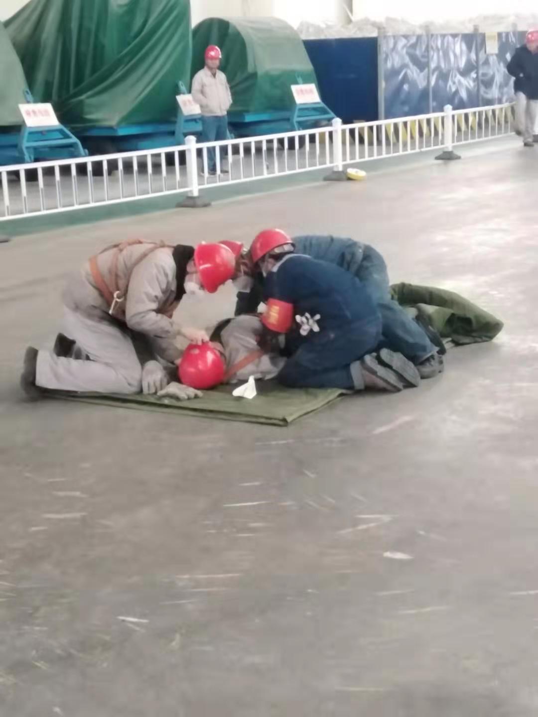 本次演練模擬的是2019年12月31日下午15:07時一名檢修工在維修101#槽出鋁端出鋁打殼氣缸異常過程中,不慎發(fā)生直流電觸電事故,檢修車間、電解車間現(xiàn)場工作人員立即開展先期救援,15:10時車間職工將觸電人員與帶電體脫離開后,根據(jù)應(yīng)急救援處置程序,立即向分公司應(yīng)急指揮辦公司電話匯報,15:14時左右應(yīng)急救援總指揮接到電話后,要求立即啟動分公司應(yīng)急救援預(yù)案,通知各救援小組迅速就位,開展救援工作,同時撥打120救護(hù)電話,請求救護(hù),并逐級匯報觸電事故情況。