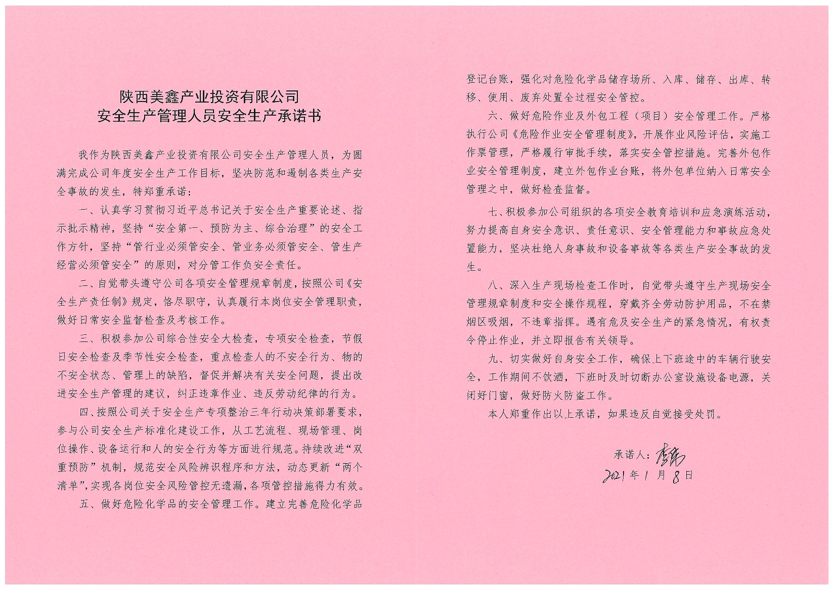 陜西美鑫產(chǎn)業(yè)投資有限公司安全承諾