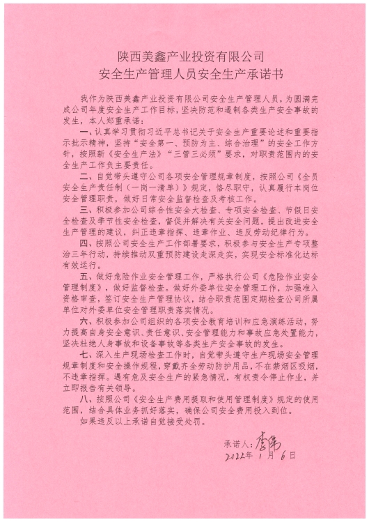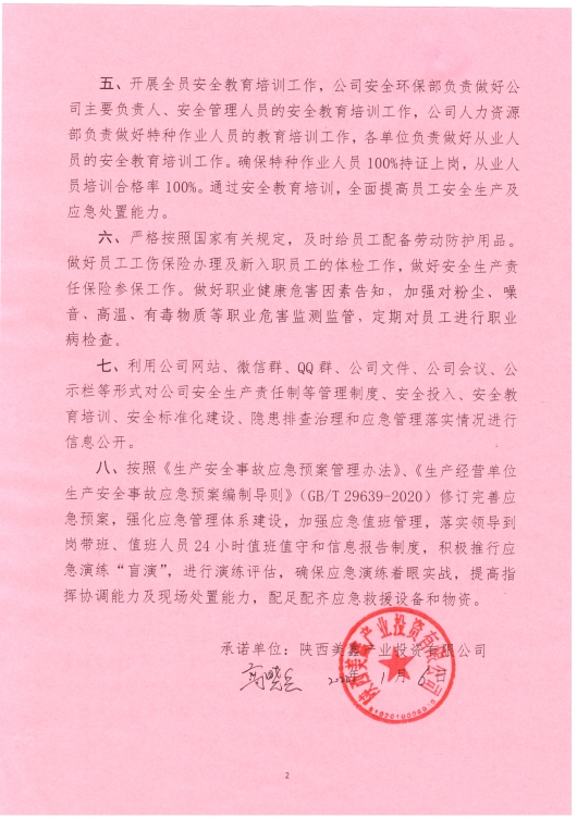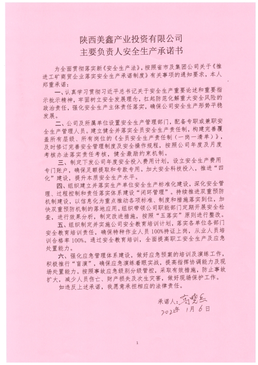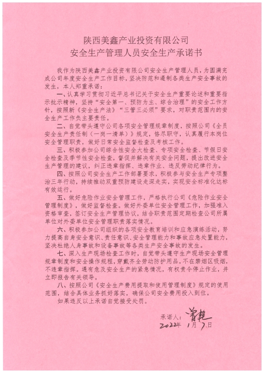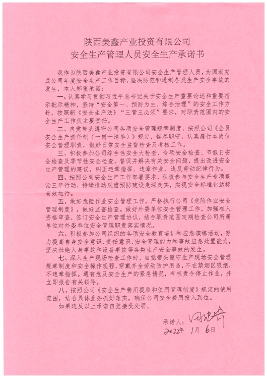 陜西美鑫產(chǎn)業(yè)投資有限公司安全生產(chǎn)承諾