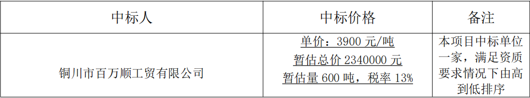 一、我公司銅鋁留守處100KA后廠區(qū)廢舊鋼材處置項目經評標小組評審,確定該項目中標人,現公示信息如下: 二、提出異議的渠道和方式: 1、提出異議的主體應當是參加招標的投標人。 2、提出異議應當以書面形式提交。 3、書面材料應當包括主要內容:3.1提出單位的名稱、地址、聯系人姓名、電話等;3.2具體事項及事實依據;3.3相關證明材料;3.4如法人親自辦理,應當由法人簽字并加蓋法人印章,同時加蓋公司公章,附營業(yè)執(zhí)照復印件和法人身份證原件及復印件;如委托代理人辦理,請?zhí)峁┓ㄈ舜硎跈嗖⒓由w公司公章,附營業(yè)執(zhí)照復印件和法人及委托代理人身份證原件及復印件;3.5聯系方式:09196982100,聯系人:全工 企業(yè)管理部 2022.6.29 |