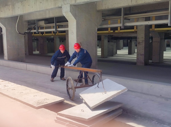 排查過程中發(fā)現(xiàn)車間地溝前后兩端雨排渠底部有大量粉塵物料堆積,極易造成雨排渠排水不暢,且雨排渠長期裸露不加封閉,影響職工通行,存在安全隱患。車間雖多次組織人員清理,但是效果不理想,在與分公司安環(huán)部溝通后,決定對雨排渠進行蓋板封閉。雨排渠蓋板每塊重達260斤,單靠人力很難把蓋板一次性放好,綜合班班員利用現(xiàn)有工具,設計出一款簡單實用的架子車,利用杠桿原理將蓋板放置到指定位置。炎炎烈日下,大家不畏酷暑一趟趟來回奔跑,齊心協(xié)力,干勁十足,充分發(fā)揮吃苦耐勞的精神,很快將雨排渠蓋板牢固穩(wěn)定地鋪蓋完成。