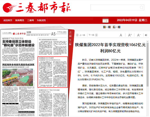 陜煤集團2022年首季實現(xiàn)營收1062億元利潤80億元 昨日,記者從陜煤集團獲悉,2022年一季度,陜煤集團主要產(chǎn)品產(chǎn)量和經(jīng)濟指標均創(chuàng)歷史新高,下屬黃陵礦業(yè)、蒲白礦業(yè)、檸條塔礦業(yè)、北元集團、紅柳林礦業(yè)等20余家單位均實現(xiàn)首季“開門紅”。陜煤集團煤炭、化工產(chǎn)品、粗鋼、發(fā)電量同比分別增長4.8%、8.4%、6.1%和9.6%。實現(xiàn)營收1062億元、利潤80億元,同比分別增長20.9%和66.7%。 據(jù)悉,目前穩(wěn)增長壓力大、任務(wù)重的緊迫形勢,陜煤集團注重精準施策,強化責任擔當。成立穩(wěn)增長工作領(lǐng)導(dǎo)小組,制定煤炭保供穩(wěn)價工作方案,建立穩(wěn)增長專項考核機制,多次召開穩(wěn)增長工作推進會,協(xié)調(diào)解決穩(wěn)增長工作中存在的突出矛盾和主要問題。 面對疫情反復(fù),陜煤集團科學組織生產(chǎn),統(tǒng)籌推進疫情防控和滿產(chǎn)達產(chǎn)。36對生產(chǎn)礦井和所有發(fā)電企業(yè)春節(jié)期間滿負荷生產(chǎn),充分釋放智能化礦井的先進產(chǎn)能,有力保障國家能源安全穩(wěn)定供應(yīng)。 發(fā)揮自有鐵路、自備車等產(chǎn)業(yè)鏈供應(yīng)鏈優(yōu)勢,陜煤集團一季度日均煤炭產(chǎn)量和發(fā)電量產(chǎn)能釋放遠超去年同期水平。扎實推進安全生產(chǎn)專項整治三年行動,持續(xù)開展安全生產(chǎn)大排查大整改,大力實施減污降碳協(xié)同增效。 同時,陜煤集團成立領(lǐng)導(dǎo)掛帥項目前期工作小組,扎實推進“十四五”項目前期手續(xù)辦理。打出強組織協(xié)調(diào)、促項目建設(shè)、控投資概算、保工程質(zhì)量“組合拳”,搶抓國家煤炭保供、發(fā)展煤基特種燃料等政策機遇,加快建設(shè)榆林化學一期、神木煤化工煤焦油加氫制環(huán)烷基油和孟村煤礦等一批“十四五”重點產(chǎn)業(yè)項目。 全力實施國企改革三年行動,持續(xù)優(yōu)化集團管控模式,積極融入秦創(chuàng)原建設(shè),設(shè)立30億元科技研究創(chuàng)新基金,聚焦新材料、新能源、新經(jīng)濟,以改革創(chuàng)新催生穩(wěn)增長新動能。下一階段,陜煤集團將堅持穩(wěn)字當頭、穩(wěn)中求進工作總基調(diào),持續(xù)鞏固生產(chǎn)企業(yè)高產(chǎn)穩(wěn)產(chǎn)態(tài)勢,大力推進重點項目建設(shè),強化資金保障,筑牢安全環(huán);A(chǔ),為全省經(jīng)濟社會健康穩(wěn)定發(fā)展和穩(wěn)增長貢獻“陜煤力量”。 |