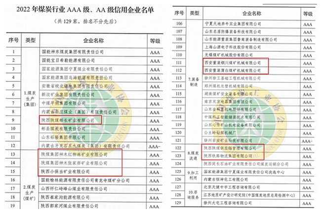 日前,中國煤炭工業(yè)協(xié)會(huì)下發(fā)了《關(guān)于公布2022年煤炭行業(yè)AAA級(jí)、AA級(jí)信用企業(yè)的通知》,陜煤集團(tuán)所屬的彬長礦業(yè)公司、紅柳林礦業(yè)公司、張家峁礦業(yè)公司、小保當(dāng)?shù)V業(yè)公司、西安重裝銅川煤機(jī)公司、西安重裝蒲白煤機(jī)公司、陜煤供應(yīng)鏈公司、鐵路物流集團(tuán)公司等8家單位榮獲“2022年煤炭行業(yè)AAA級(jí)信用企業(yè)”稱號(hào)。 近年來,陜煤集團(tuán)及所屬單位堅(jiān)持誠信為本的經(jīng)營理念,在引領(lǐng)行業(yè)誠信經(jīng)營方面作出了突出貢獻(xiàn),樹立了良好形象,贏得了社會(huì)各界與客戶的普遍信賴與贊譽(yù)。 據(jù)了解,企業(yè)信用等級(jí)評(píng)價(jià)考核企業(yè)經(jīng)營管理、誠信建設(shè)、財(cái)務(wù)實(shí)力、信用記錄、發(fā)展能力等數(shù)十項(xiàng)指標(biāo),全面綜合評(píng)價(jià)企業(yè)誠信建設(shè)和信用管理水平,提高了企業(yè)的整體公信度,在全國范圍內(nèi)影響頗深。此次煤炭企業(yè)信用等級(jí)評(píng)價(jià)工作是中國煤炭工業(yè)協(xié)會(huì)推進(jìn)煤炭行業(yè)信用體系建設(shè),進(jìn)一步弘揚(yáng)“誠信文化”、凝聚“榜樣力量”、共建“信用煤炭”,加快提升煤炭企業(yè)信用管理水平的具體舉措。此次經(jīng)過企業(yè)申報(bào)、現(xiàn)場(chǎng)評(píng)審、專家評(píng)議、社會(huì)公示等程序,共有129家企業(yè)榮獲煤炭行業(yè)AAA級(jí)、AA級(jí)信用企業(yè)稱號(hào)。 |