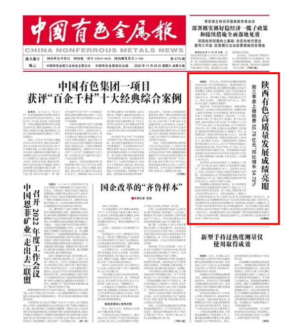 中國(guó)有色金屬報(bào):陜西有色高質(zhì)量發(fā)展成績(jī)亮眼 前三季度上繳稅費(fèi)52.79億元,同比增長(zhǎng)54 ...