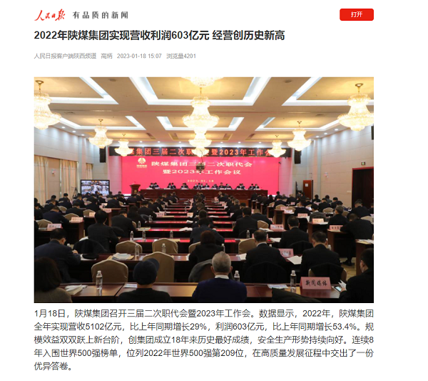 媒體關(guān)注| 陜煤集團2022年實現(xiàn)營收5102億元和利潤603億元