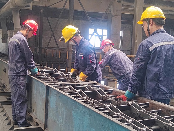 近期,陽極分公司煅燒車間#5罐式煅燒爐埋刮板輸送機(jī)在上料過程中突發(fā)故障停運(yùn),經(jīng)檢修人員緊急拆機(jī)檢查,發(fā)現(xiàn)是埋刮板輸送機(jī)鏈條銷釘長(zhǎng)期腐蝕磨損斷裂所致。 根據(jù)車間目前生產(chǎn)情況及料位存儲(chǔ)狀況,在降低排料量情況下也只能維持6個(gè)小時(shí)生產(chǎn),搶修工作刻不容緩。為高效完成搶修任務(wù),車間立即成立搶修工作小組,研究制定搶修方案和應(yīng)急預(yù)案,由檢修班組牽頭,生產(chǎn)班組全力配合,車間管理人員現(xiàn)場(chǎng)監(jiān)督指導(dǎo)。搶修過程中,生產(chǎn)班組通過手動(dòng)排動(dòng)電機(jī),定位板鏈合適位置,人工快速清理堵塞原料;檢修班組兵分兩路,分別對(duì)變形嚴(yán)重的板鏈進(jìn)行矯正拆除更換。大家克服爐面溫度高、變形損壞板鏈更換難度大等因素,各工序積極配合,爭(zhēng)分奪秒,終于在料位達(dá)到警戒線前完成了兩處6米長(zhǎng)板鏈搶修更換工作。經(jīng)調(diào)試后運(yùn)行狀態(tài)良好,搶修工作圓滿完成,設(shè)備也隨之恢復(fù)運(yùn)行生產(chǎn)。 此次設(shè)備搶修,確保了車間安全生產(chǎn)平穩(wěn)運(yùn)行,有效檢驗(yàn)了車間的組織管理能力和人員的協(xié)同配合能力,增加了搶修工作經(jīng)驗(yàn)和業(yè)務(wù)技能。接下來,車間將進(jìn)一步加強(qiáng)設(shè)備保養(yǎng)維護(hù)和日常巡視檢查工作,將設(shè)備安全隱患消除在萌芽狀態(tài),切實(shí)保證車間設(shè)備安全、人員安全。 |