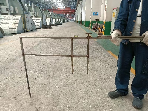 電解二車(chē)間黨支部創(chuàng)新小組經(jīng)過(guò)反復(fù)測(cè)量、材質(zhì)比對(duì),最終成功升級(jí)改造成“新式上測(cè)釬”,其結(jié)構(gòu)更為簡(jiǎn)化,使用過(guò)程中更加精確!靶率缴蠝y(cè)釬”長(zhǎng)為150cm,中高為35cm,主材使用20mm×20mm的不銹鋼方管,實(shí)際使用中為了減小誤差增加了固定式水平儀、鑲嵌式兩用量錘、調(diào)水平旋轉(zhuǎn)頂桿、前可更換式測(cè)頭直筋等部件,設(shè)計(jì)懸測(cè)高度10cm,旋轉(zhuǎn)調(diào)整高度區(qū)間為3cm,大量使用不繡鋼材質(zhì)減輕磁場(chǎng)帶來(lái)的作用力。