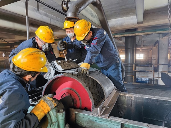 在本輪停運檢修期間,成型車間結(jié)合生產(chǎn)實際,制定詳實的工作方案和應(yīng)急預(yù)案。由于維修作業(yè)空間小、更換時間緊,車間決定由維修班和生產(chǎn)二班數(shù)十人互相配合共同對斗式提升機皮帶進行更換。更換現(xiàn)場,作業(yè)人員嚴格遵守安全操作規(guī)程要求及預(yù)定方案,經(jīng)過三天的共同努力完成了100多米舊皮帶和近200個料斗的更換安裝。同時充分利用停運時機,完成了兩對滾軸更換工作,保證了后期生產(chǎn)線的平穩(wěn)運行。