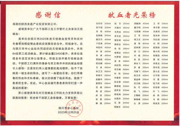 近日,公司收到了一封來自銅川市中心血站的感謝信,信中銅川市中心血站表達了對公司青年員工積極參與無償獻血的感謝之情和誠摯敬意。