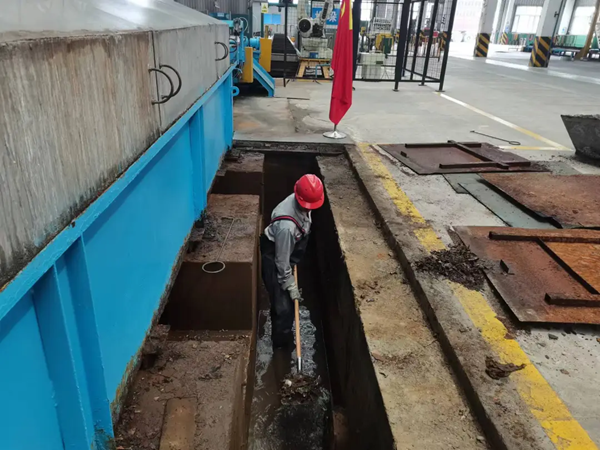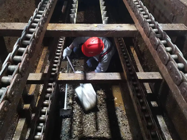 此次清淤工作的主要挑戰(zhàn)是冷運機冷卻噴淋系統(tǒng)水溝屬于半封閉狀態(tài),由于淤泥長時間未清理,水溝底部淤泥積累的有害氣體對作業(yè)人員的生命安全造成隱患。為確保清淤人員的安全,在開始作業(yè)前,車間負責人對作業(yè)人員進行了有限空間作業(yè)再培訓,要求作業(yè)人員務必做好各種安全防護,先通風、再檢測、后作業(yè)。同時對監(jiān)護人進行了專項培訓,確保此項工作安全有序進行。清淤過程中,黨員率先垂范,身著連體雨衣,克服環(huán)鏈與地溝之間狹小有限空間難題,手握鐵鍬,或蹲或趴在地溝下作業(yè),一鍬一鍬的把污泥鏟出來裝滿鐵桶運至地面,往復進行。經(jīng)過大家共同努力,淤泥被清理干凈,水溝煥然一新。