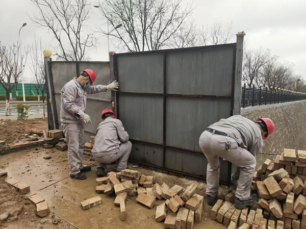 黨員們爭分奪秒地投入到排水工作中,擋堵墻附近積水嚴(yán)重,大家起初用掃把清掃,但因排水管位置較高排水速度緩慢。為提高效率,大家改用鐵锨將水鏟入水桶,再快速倒入排水溝。在作業(yè)過程中,大家嚴(yán)格遵守安全規(guī)定,相互提醒、相互幫助,經(jīng)過一個多小時的艱苦奮戰(zhàn),終于清理完積水,為后續(xù)的封堵工作奠定了基礎(chǔ)。積水清理完畢后,為徹底消除安全隱患,黨員們緊接著用圍擋對邊坡豁口區(qū)域進(jìn)行封堵,大家仔細(xì)挑選合適位置將圍擋固定好并用磚頭壓實,確保圍擋在強(qiáng)風(fēng)天氣下也能穩(wěn)固。