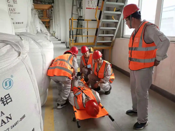 演練開始前,所有參演人員集中學(xué)習(xí)了高處墜落應(yīng)急預(yù)案和演練方案,明確了各自的職責(zé)和任務(wù)。本次演練現(xiàn)場(chǎng)模擬天車工在1#氧化鋁庫打料作業(yè)完成后,不慎從天車樓梯2米處滑落地面后組織救援的過程!笆鹿省卑l(fā)生后,現(xiàn)場(chǎng)按照應(yīng)急預(yù)案迅速啟動(dòng)救援處置程序。演練共分為事故發(fā)生、事故匯報(bào)、預(yù)案啟動(dòng)、現(xiàn)場(chǎng)緊急救治、送醫(yī)治療五部分。各小組聞令而動(dòng)、密切配合、冷靜應(yīng)對(duì),整個(gè)過程組織有序、反應(yīng)迅速、程序合理,演練達(dá)到了預(yù)期效果。