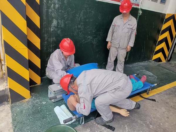 演練前,全體參演人員系統(tǒng)學習演練方案,明確崗位職責與分工。本次演練模擬電解車間1-7多功能機組高空作業(yè)場景,在超50℃高溫環(huán)境下,檢修人員作業(yè)過程中一名員工突發(fā)中暑。險情發(fā)生后,車間迅速啟動高空高溫中暑應(yīng)急預案,按照“險情發(fā)現(xiàn)—緊急匯報—預案啟動—現(xiàn)場救援—送醫(yī)治療”全流程展開。各應(yīng)急小組反應(yīng)迅速、配合默契,高效完成傷員轉(zhuǎn)移、降溫急救、醫(yī)療轉(zhuǎn)運等環(huán)節(jié),演練全程組織有序、處置規(guī)范,達到預期效果。